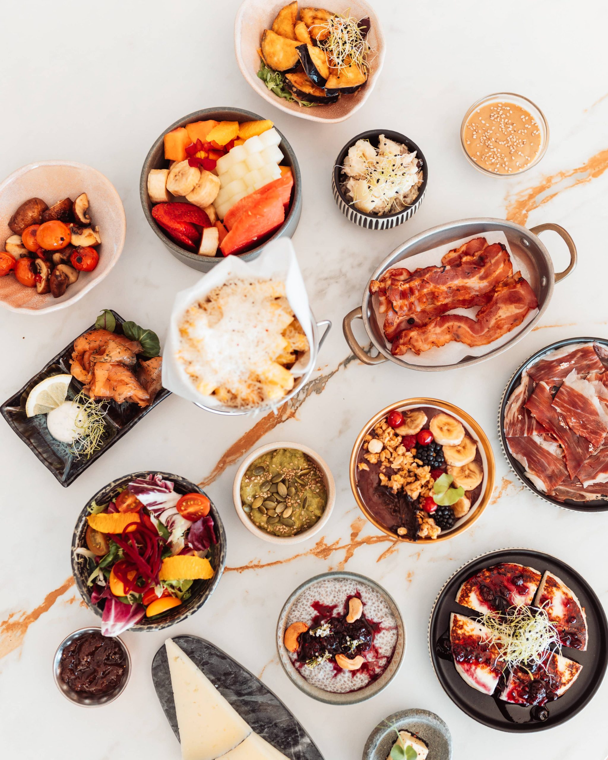 - 01 Bacon Platter Free-range fried egg, grilled bacon strips, slice of sourdough bread, seasonal fruit salad (km 0), homemade chia, coconut, and butter pudding 16.00€